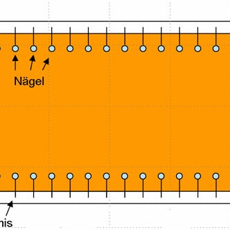 As described in the following pictures, insert the fastening nails or screws for the rubber bands into the screen plate. The distance to the edges should be approx. 10 cm or more. The area to be folded over and the width of the frame must be added to the dimensions of the visible area. If you require other values than those available in the shop, please simply send an email to info@leinwandbau.info .