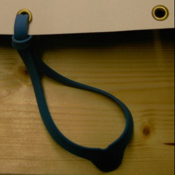 8.: I used household rubber bands (flattened slightly in one place with scissors) so that you can put them through the eyelets or holes in the canvas.